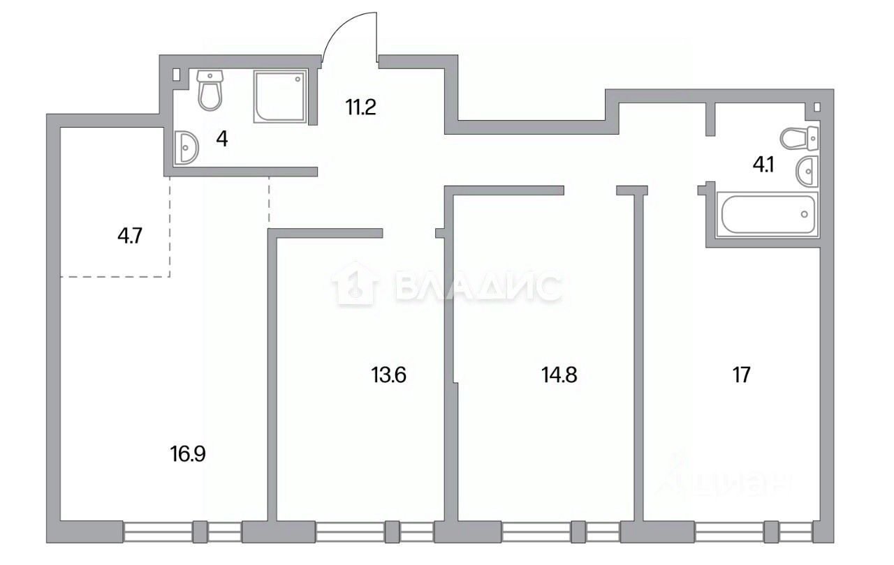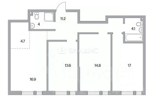 Четыре изолированные комнаты с площадями 13,6 + 14,8 + 17 + 16,9 кв. м предлагают множество возможностей для зонирования пространства. Такая планировка отлично подойдёт для большой семьи.