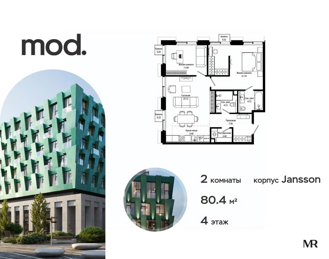 Продается 2-комнатная квартира площадью 80.41 м² с предчистовой отделкой в ЖК Mod на 4-м этаже 7 этажного дома.