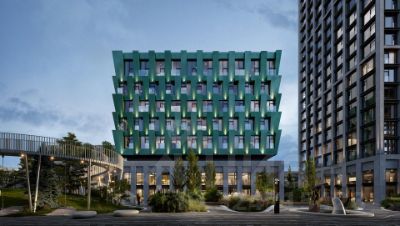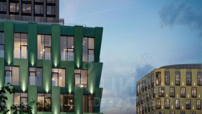 Девятиэтажные корпуса с фасадами из натурального камня на уровне первого этажа. Выше — панели из натуральных меди и латуни, которые со временем окисляются и меняют