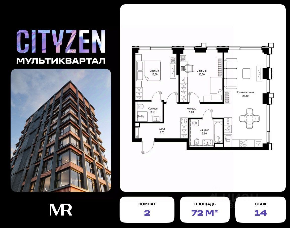 Продается 2-комнатная квартира от застройщика в жилом мультиквартале CITYZEN на 14-м этаже в корпусе #2 урбан-блока PARUS. Общая площадь лота составляет 72 м²