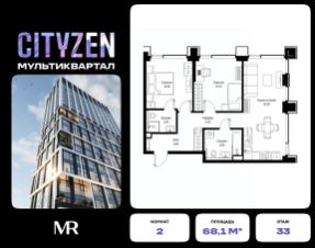 Продается 2-комнатная квартира от застройщика в жилом мультиквартале CITYZEN на 33-м этаже в корпусе #2 урбан-блока PARUS. Общая площадь лота составляет 68.10 м²