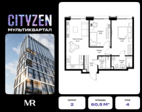Продается 2-комнатная квартира от застройщика в жилом мультиквартале CITYZEN на 4-м этаже в корпусе #4 урбан-блока PARUS. Общая площадь лота составляет 60.50 м²