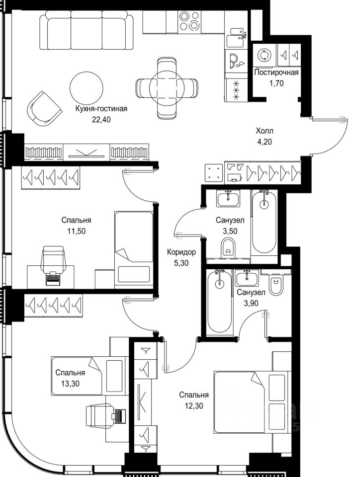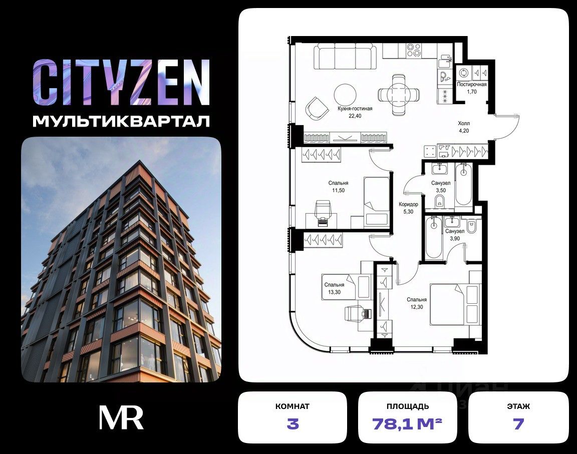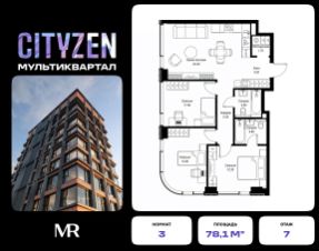 Продается 3-комнатная квартира от застройщика в жилом мультиквартале CITYZEN на 7-м этаже в корпусе #1 урбан-блока PARUS. Общая площадь лота составляет 78.10 м²