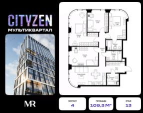 Продается 4-комнатная квартира от застройщика в жилом мультиквартале CITYZEN на 13-м этаже в корпусе #1 урбан-блока PARUS. Общая площадь лота составляет 109.30 м²