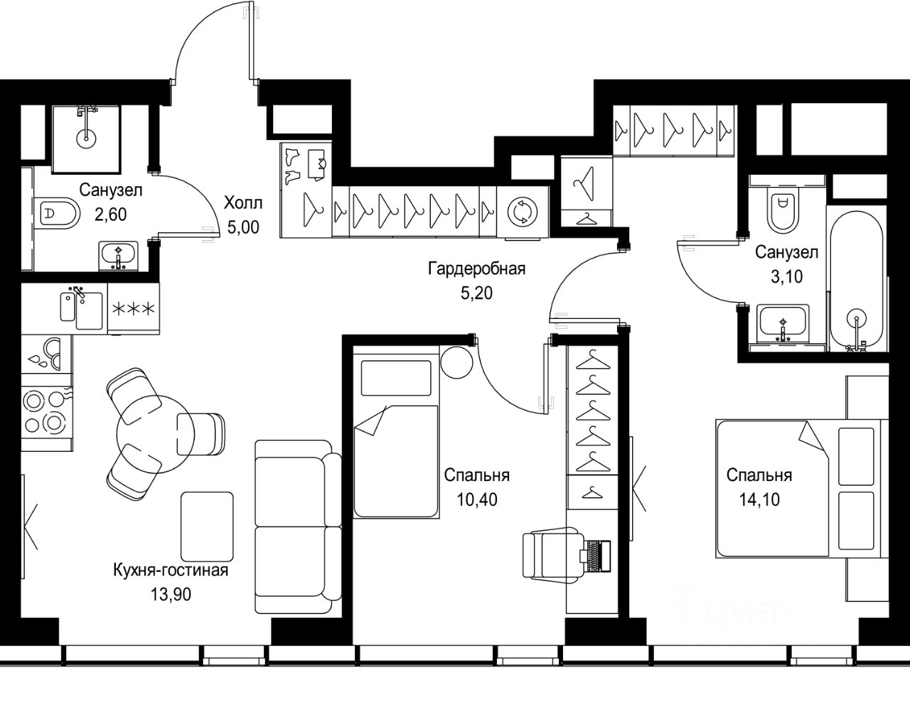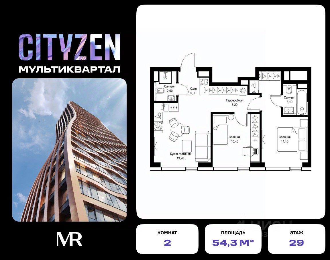 Продается 2-комнатная квартира от застройщика в жилом мультиквартале CITYZEN на 29-м этаже в корпусе #6 урбан-блока VOLNA. Общая площадь лота составляет 54.30 м²