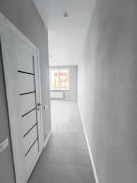 Отделка чистовая в серых тонах. В ванной комнате имеется сантехника.