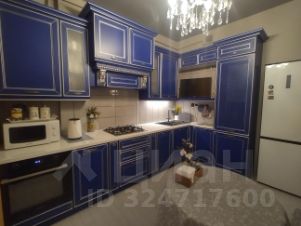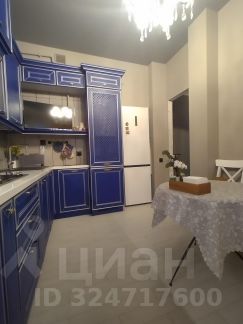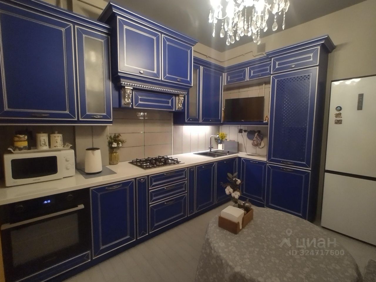 Кухня выполнена из материалов немецкого качества, фасады чистого василькового цвета с серебристой патиной. Пространство гарнитура наполнено выдвижными системами BLUM: под варочной панелью система хранения кастрюль и сковородок, верхний левый шкаф оснащен опускающейся верхней полкой, нижний шкаф справа от духового шкафа оснащен тремя выдвижными ящиками. Кухня оснащена раковиной с двумя чашами, дозатором для моющего средства, измельчителем пищевых отходов и 4-х ступенчатой системой очистки воды Аквафор. Увеличенная глубина столешницы 70 см. На кухне установлен двухконтурный газовый котел BAXI (Италия).