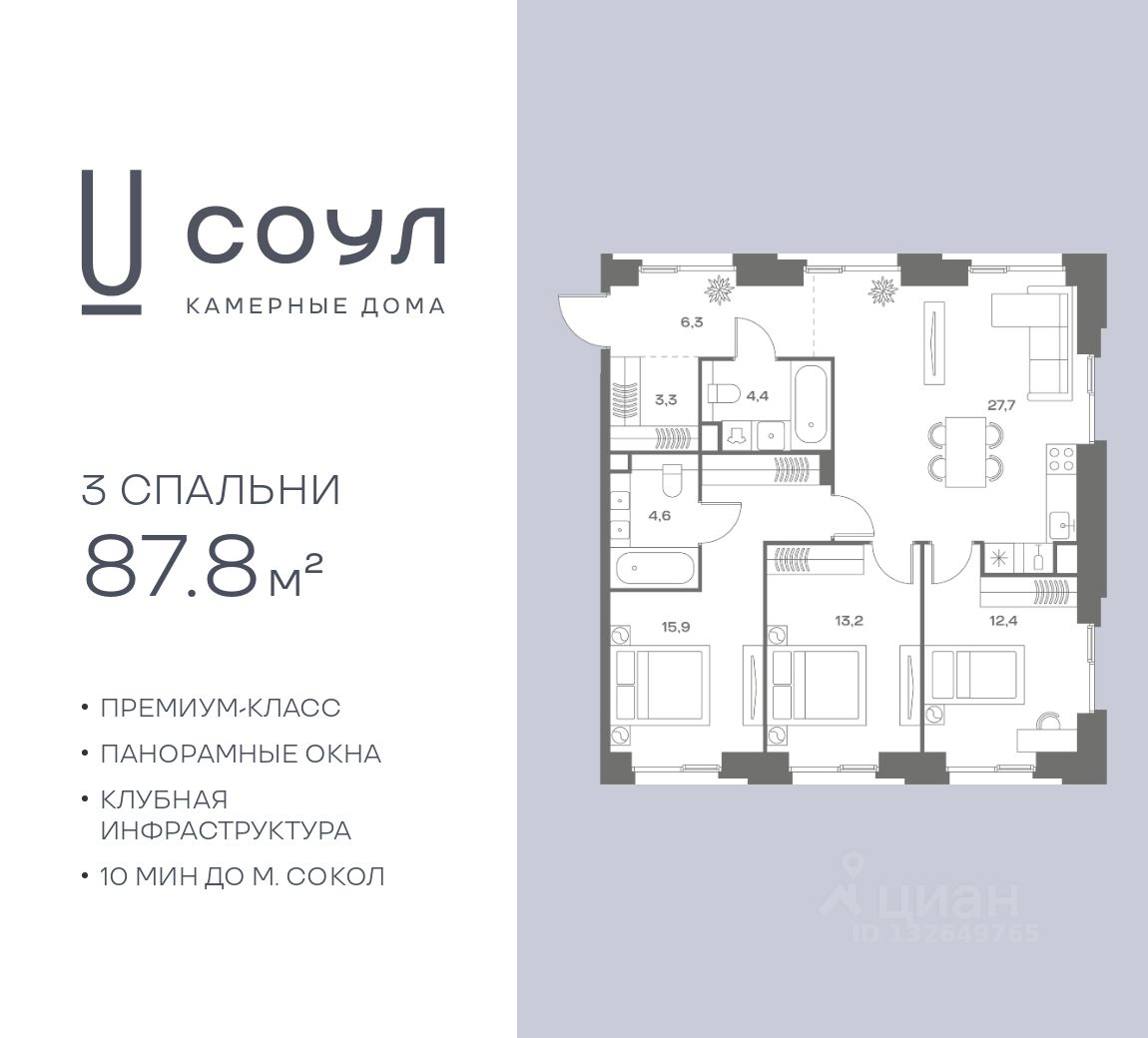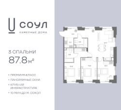 Продается 3-к. квартира номер 259 общей площадью 87.8 кв.м. на 4-м этаже 8 этажного дома, камерные дома СОУЛ (премиум-класс). Без отделки.