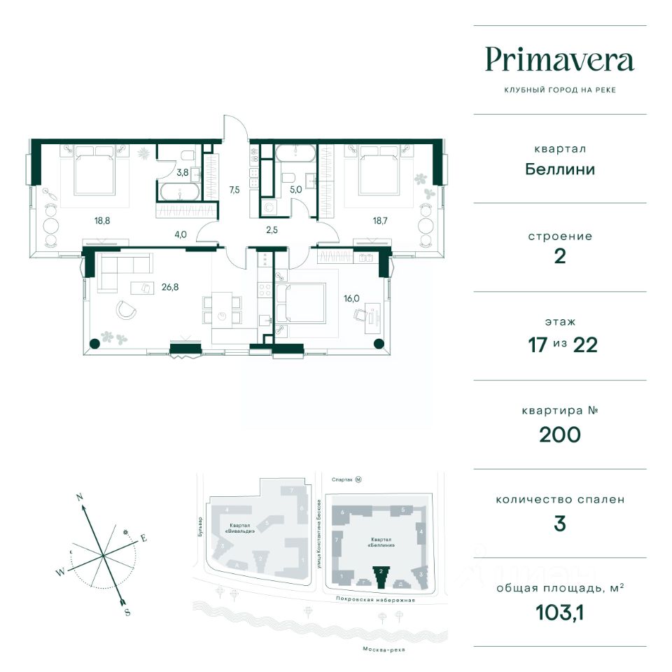Клубный город на реке Primavera — это современный жилой комплекс премиум-класса, расположенный на первой береговой линии Москвы-реки в экологически чистом районе Покровское-Стрешнево. Под панорамными окнами квартир находится собственный экопарк с продуманной сетью прогулочных дорожек и современными детскими и спортивными площадками. За парком расположена набережная с собственным пляжем и зонами для отдыха. Клубный город на реке Primavera предлагает широкий выбор планировок для различных жизненных сценариев: от просторных однокомнатных квартир до пентхаусов и жилых помещений с террасами и патио. Выберите из 120 вариантов эргономичных планировок стандартного и евроформата. Из каждой квартиры открываются красивые виды на реку с углом обзора в 270 градусов. Дизайнерские лобби предлагают панорамный обзор на благоустроенный двор. Высокие потолки в 6 метров и качественная отделка создают атмосферу, схожую с пятизвездочными отелями. В Primavera есть всё необходимое для комфортной жизни в мегаполисе: • Образование для детей в шаговой доступности: 4 школы, 8 детских садов и развивающие центры с кружками и секциями. • Удобства на расстоянии приятной прогулки: супермаркеты, кафе, рестораны с верандами, салоны красоты, аптеки и многофункциональный центр для шоппинга и развлечений. • Умный дом: автоматизированное бесконтактное управление основными системами доступа и безопасности через мобильное приложение. Клубный город на реке Primavera выгодно сочетает комфорт городской жизни с близостью к природе. Живите в месте, где все создано для вашего удобства!