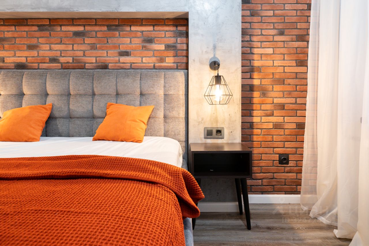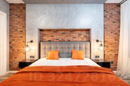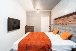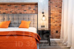 В спальне особого внимания заслуживает изголовье кровати, выполненное вручную из шлифованного бетона с подсветкой. Можно выбрать сценарий освещения под фильм или пижамную вечеринку.