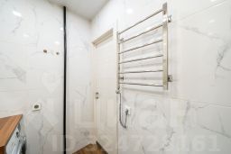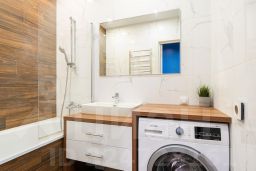 В сан. узле стиральная машина органично вписалась в гарнитур под столешницей и не мешает проходу, вам не придется думать куда ее поставить.