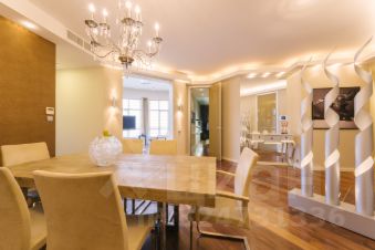 Атмосферное пространство с отделкой от итальянского дизайнера, сочетает в себе роскошь, изящество и удивительную практичность. Мягкая мебель обтекаемых форм обеспечивает удобство, а приятная сливочно-шоколадная цветовая гамма делает обстановку комфортной. Трюфельные и сливочные оттенки в дизайне холла и кухни создают эффектный контраст, делая интерьер выразительным. А в качестве ярких акцентов использованы золотистые и хромированные предметы и аксессуары. Все это наполняет интерьер неповторимым стилем и характером.