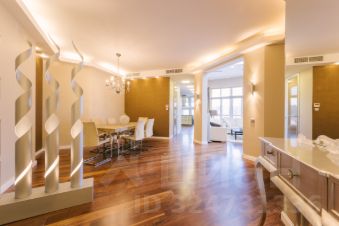 Гостиная с атриумом и гостевым с/у; кухня с техникой от лучших европейских производителей; 1-я мастер-спальня с ванной комнатой, гардеробной и лоджией; 2-я спальня с гардеробной, с/у и душем.