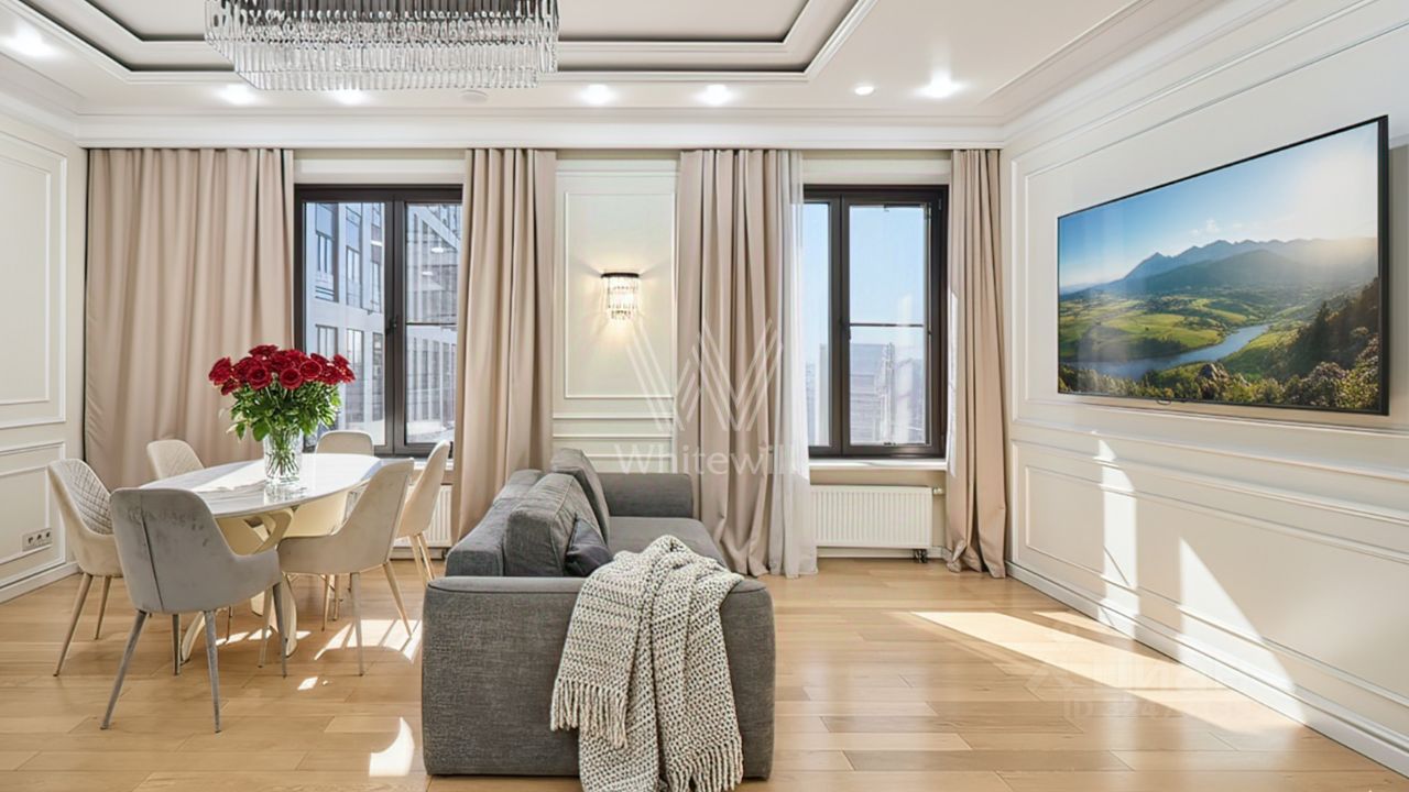 Угловая квартира с 4 спальнями общей площадью 108 м² в комплексе бизнес-класса "Царская площадь". Квартира с авторской отделкой расположена на 11 этаже в корпусе "Романовский". Интерьер в классическом стиле украшают декоративные молдинги, многоуровневые потолки и дизайнерские люстры. Продуманы различные сценарии освещения.