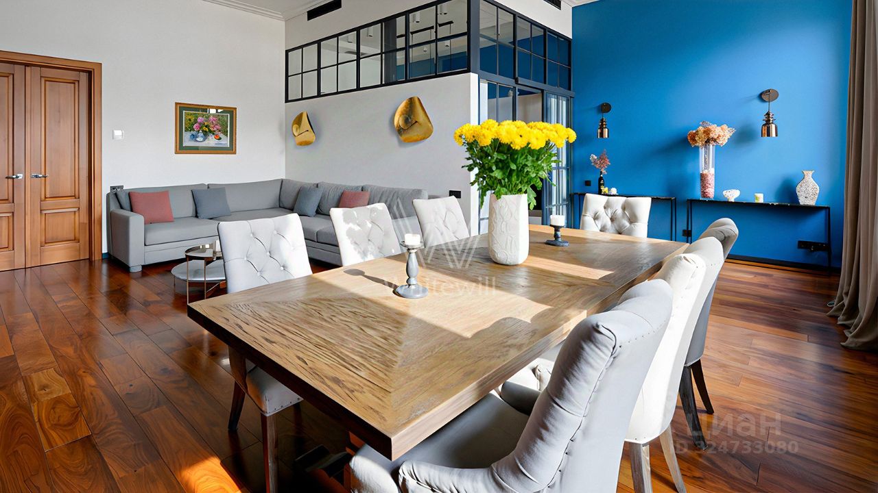 Отделка и дизайн разработан и реализован студией Николая Цупикова. На полу выложены плитка и паркетная доска. Квартира полностью укомплектована мебелью и бытовой техникой.