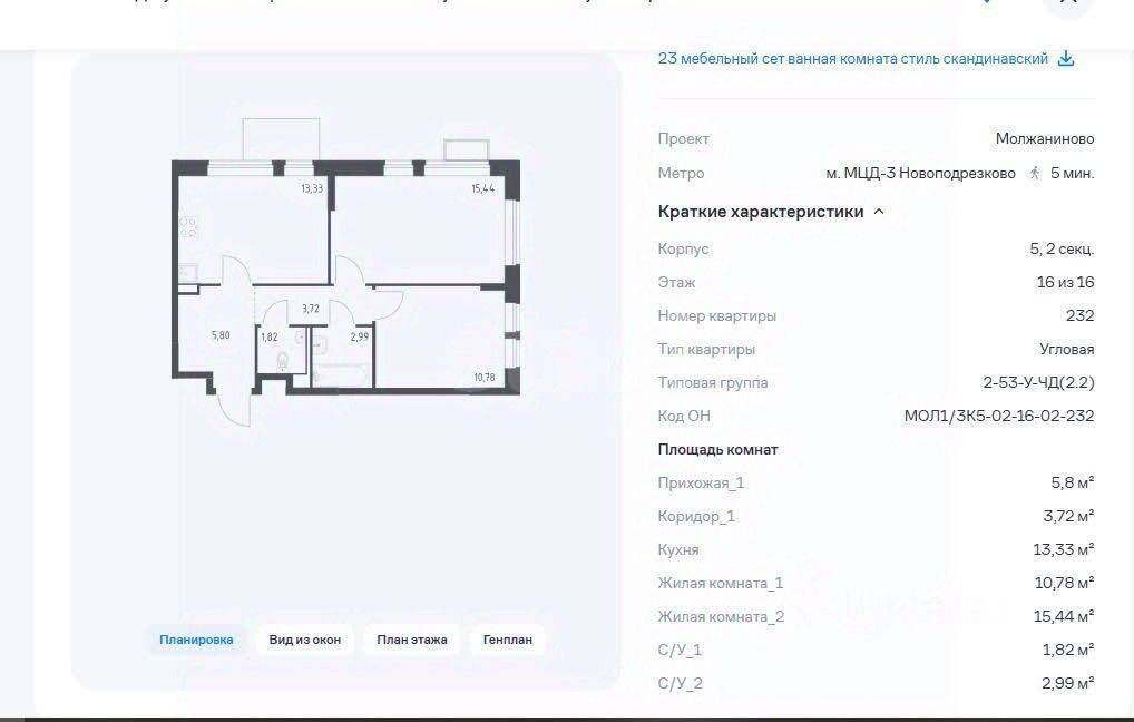 Продаётся 2комнатная квартира в ЖК "Молжаниново" (Москва, САО)