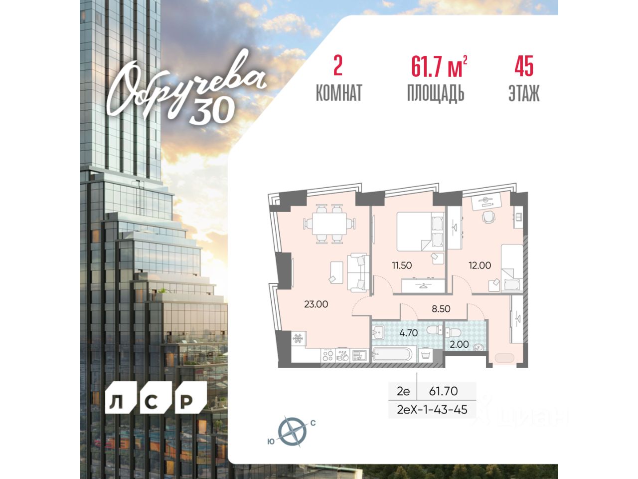 Продается 2-комнатная квартира общей площадью 61.7 кв. метров на 45 этаже дома бизнес-класса "Обручева 30". Дом располагается в 5 минутах ходьбы до станции метро "Калужская" и 10 минутах до станции метро "Воронцовская". Для автомобилистов удобный и быстрый выезд на улицы Обручева и Профсоюзную.