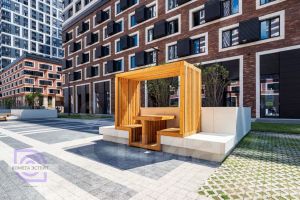 - двор без машин, много прогулочных зон, деревянный амфитеатр, отдельные спортивные, детские и собачьи площадки;
