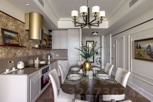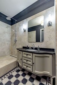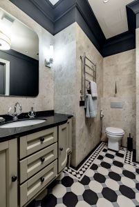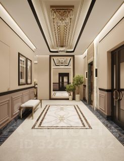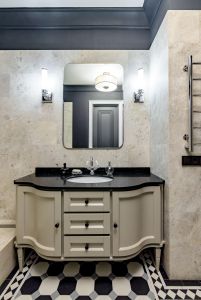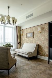 Паркет и двери - инженерная доска из дуба, паркет выложен классическими квадратами - авторский проект. Натуральный мрамор, плитка орнамент ручной работы - метлах, английские обои. На стенах в изголовье кровати выполнено панно из натурального дуба - раскладка французской елки.