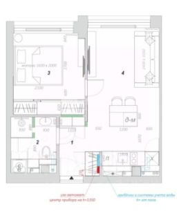Кухня и мебель изготовлены на заказ, много мест для хранения: шкафы в прихожей и большой гардеробный шкаф в спальне.