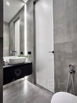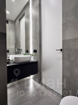 Санузел облицован качественной широкоформатной плиткой с запилом под 45 градусом. Качественная сантехника, трубы Rehau, пол с подогревом, дополнительная подсветка.