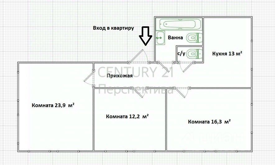-3 изолированные комнаты ( 16,3; 12,1; 23,9 кв. метров)