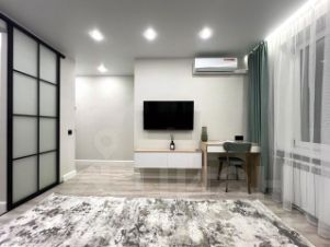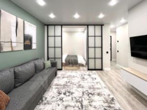 Функциональная, продуманная до мелочей планировка. Комната разделена стеклянной перегородкой на две зоны: уединенная спальня с двуспальной кроватью с подъемным механизмом (позволяющим использовать пространство под ней в качестве дополнительной зоны хранения) и гостиная с раскладывающимся диваном, ТВ зоной и выделенной рабочей зоной. Уютная кухня (укомплектована современной техникой: варочная панель, духовой шкаф, холодильник, вытяжка, встроенная свч печь). Отдельная ванная комната с теплым полом. Грамотно организована зона хранения в прихожей. Установлен вместительный шкаф. Предусмотрена зона дополнительного места хранения, где установлена стиральная машина. Застекленный балкон!