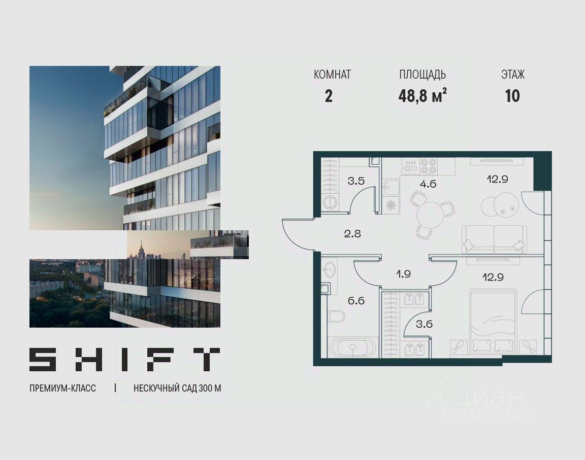 1-к квартира в премиальном комплексе SHIFT на 10-м этаже в 18 этажном здании. Общая площадь 48.8 кв. м.