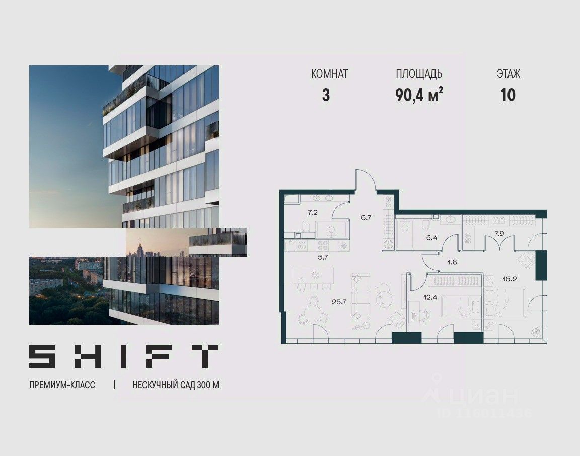 3-к квартира в премиальном комплексе SHIFT на 10-м этаже в 18 этажном здании. Общая площадь 90.4 кв. м.