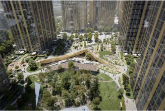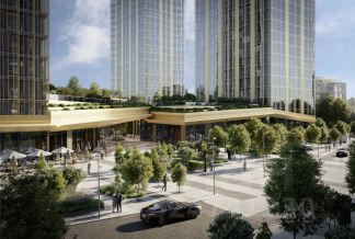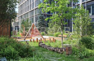 • Приватный двор-сад на кровле стилобата площадью около 7700 м² с амфитеатром, террасой для йоги, детской игровой зоной и площадкой для воркаута.
