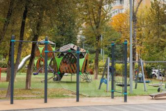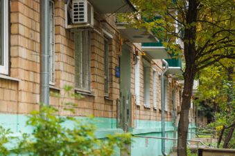 Опрятный, чистый подъезд после ремонта, зеленый двор.