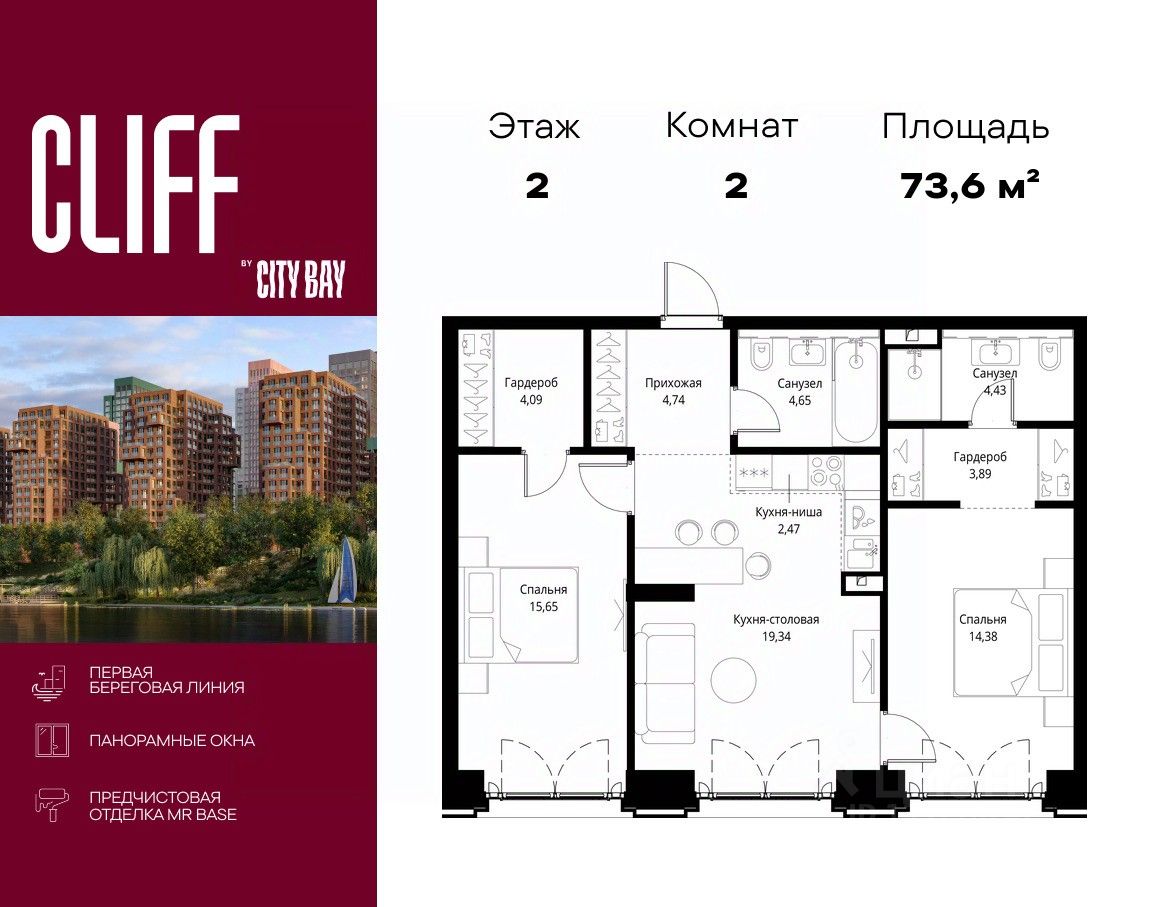 Продаётся 2-комнатная квартира общей площадью 73.64 м² с предчистовой отделкой в ЖК City Вау, квартале Cliff, на 2-м этаже 15 этажного дома.