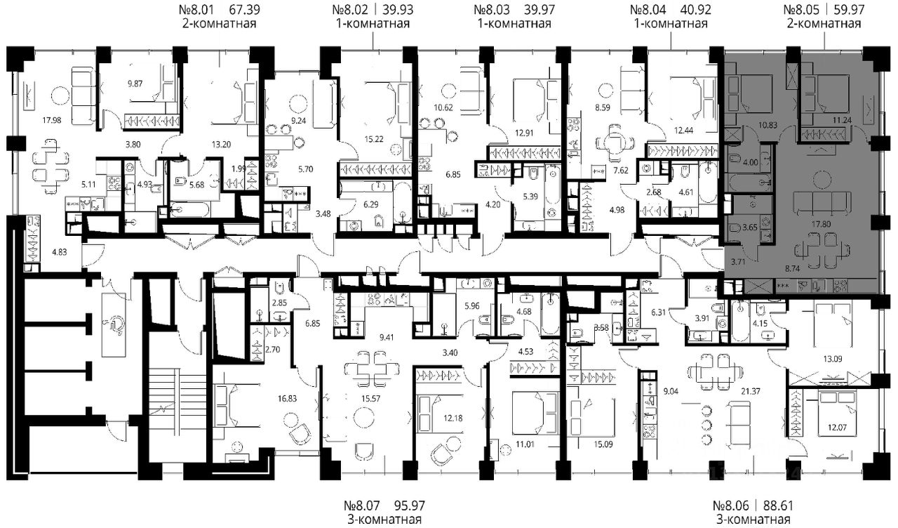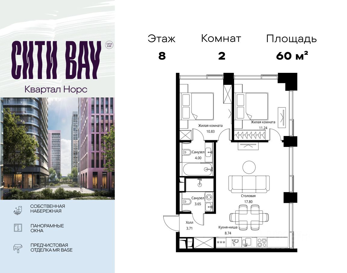 Продаётся 2-комнатная квартира общей площадью 59.97 м² с предчистовой отделкой в ЖК Сити Бэй, квартале Норс, на 8-м этаже 27 этажного дома.