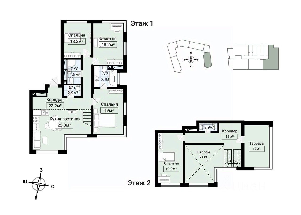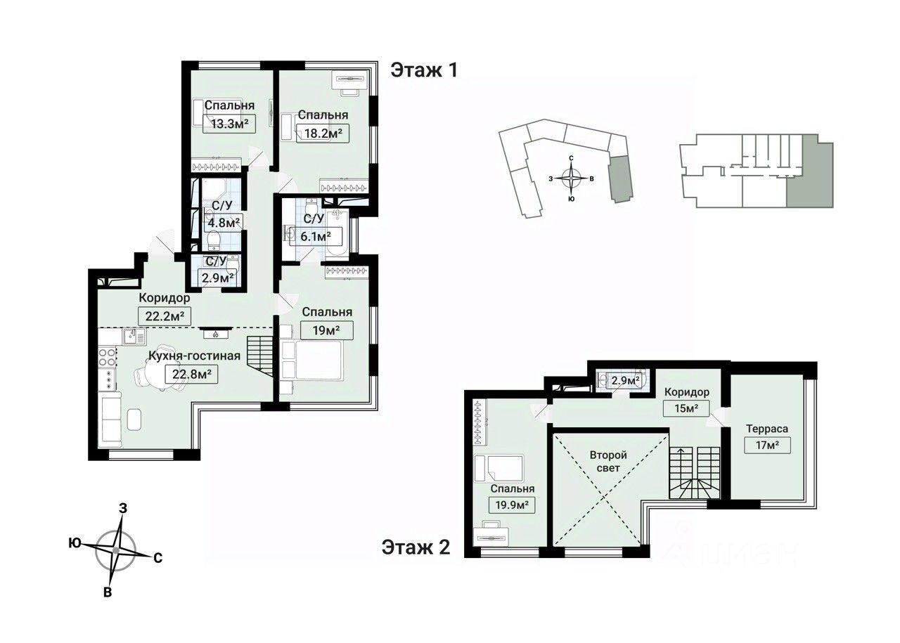 Предлагается к продаже уникальный пентхаус в ЖК бизнес-класса! Главным преимуществом этого варианта является второй свет, который можно как оставить в качестве кухни-гостиной с высотой потолка 7,5 м, так и расширить второй этаж для увеличения полезной площади. Потолки первого этажа (без второго света) — 3,7 м, второго — 3,55 м.