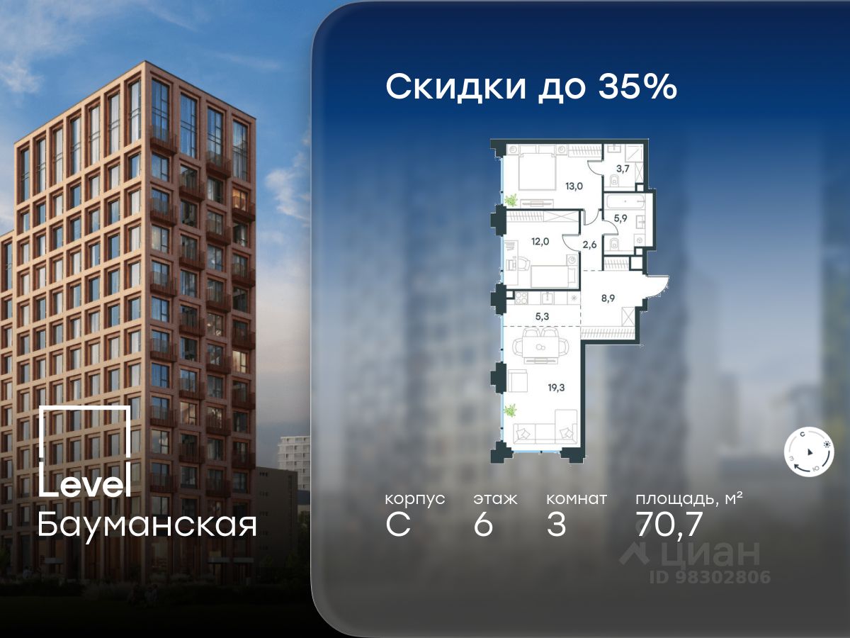 В Басманном районе (ЦАО) продается 3-комнатная квартира площадью 70.70 кв.м без отделки. Квартира расположена на 6 этаже 21-этажного корпуса " C" в жилом комплексе бизнес-класса Level Бауманская (компания Level Group).