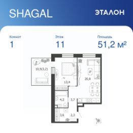 Общая площадь квартиры — 51.2 кв. м, этаж 11 из 19.