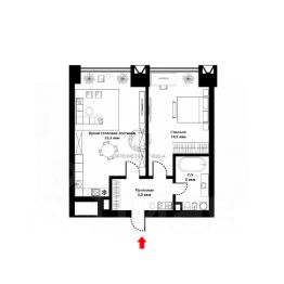 Планировочное решение: кухня с обеденной зоной и гостиной, изолированная спальня, совмещенный санузел, прихожая