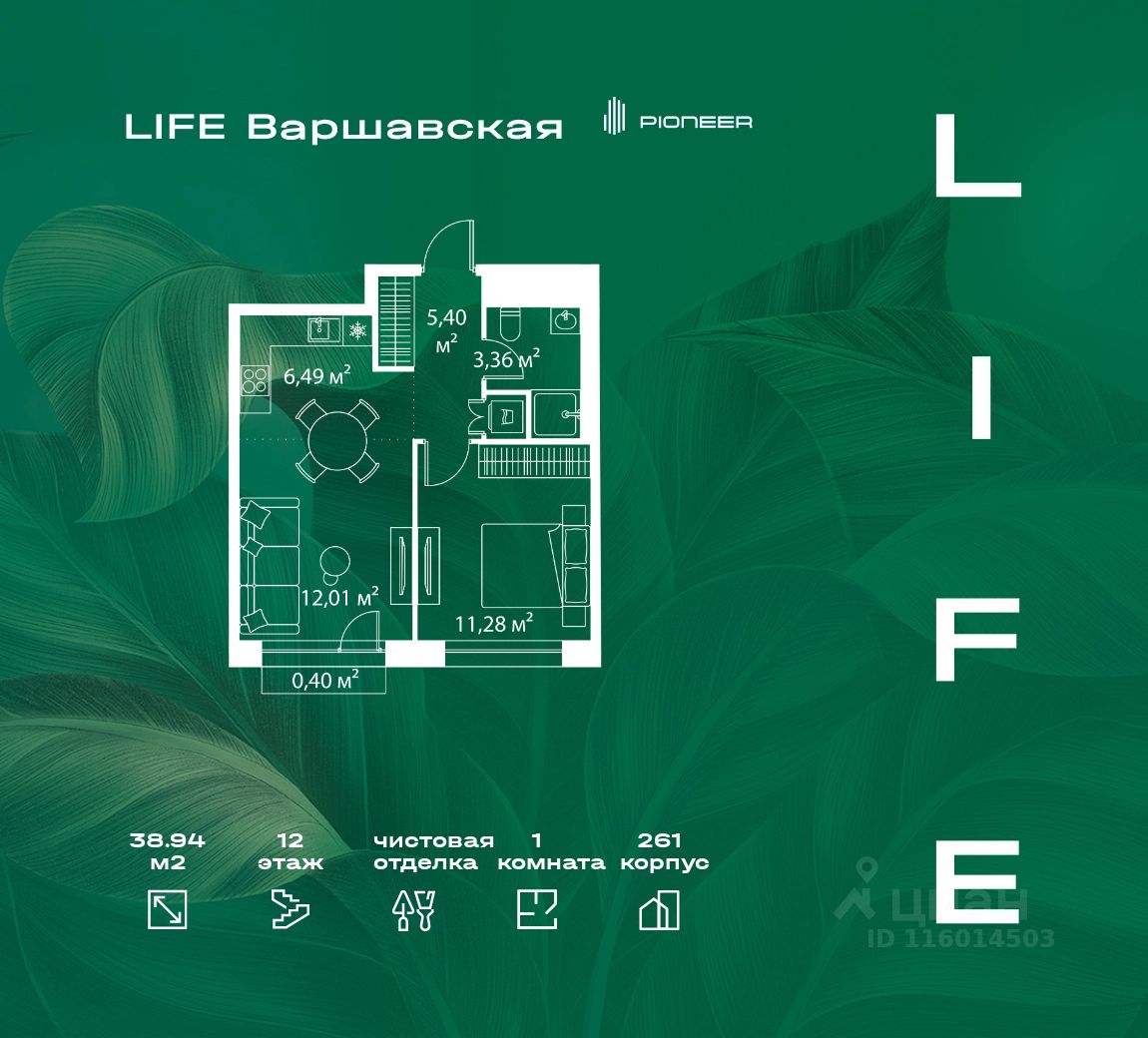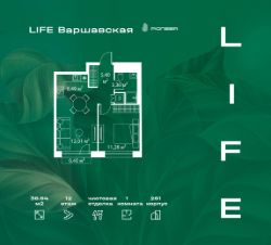 В районе Москворечье-Сабурово продается 1-комнатная квартира площадью 38.94 м². Она расположена на 12 этаже в 261 корпусе нового жилого квартала LIFE Варшавская.
