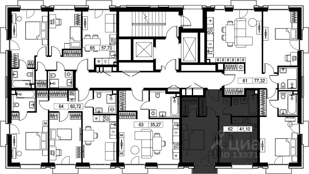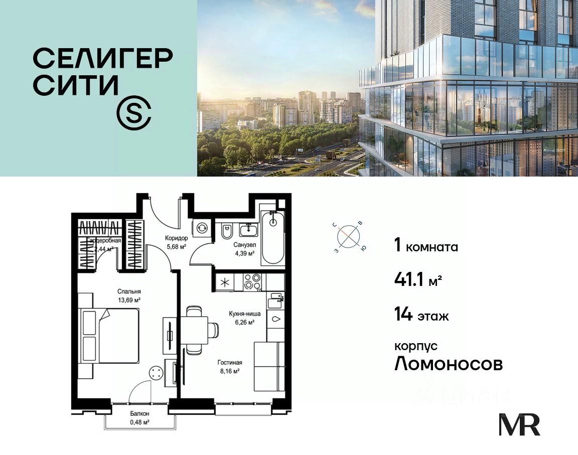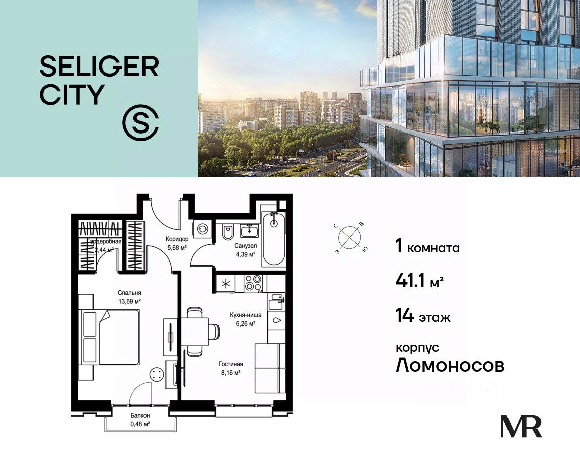 Продаётся 1-комнатная квартира общей площадью 41.10 м² без отделки в ЖК "Селигер Сити" на 14-м этаже корпуса Ломоносов.