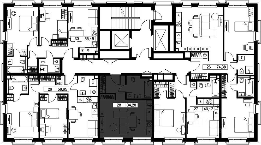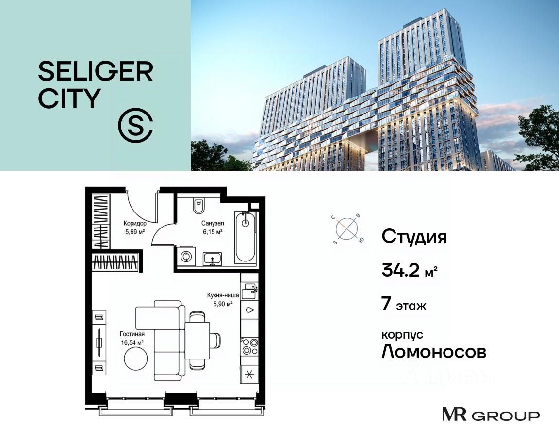 Продаётся студия общей площадью 34.28 м² без отделки в ЖК "Селигер Сити" на 7-м этаже корпуса Ломоносов.