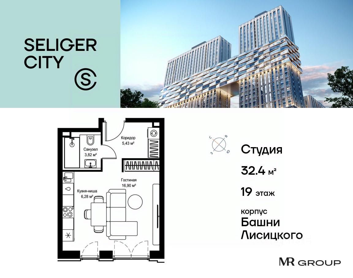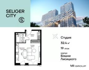 Продаётся студия общей площадью 32.43 м² без отделки в ЖК "Селигер Сити" на 19-м этаже башни Лисицкого.