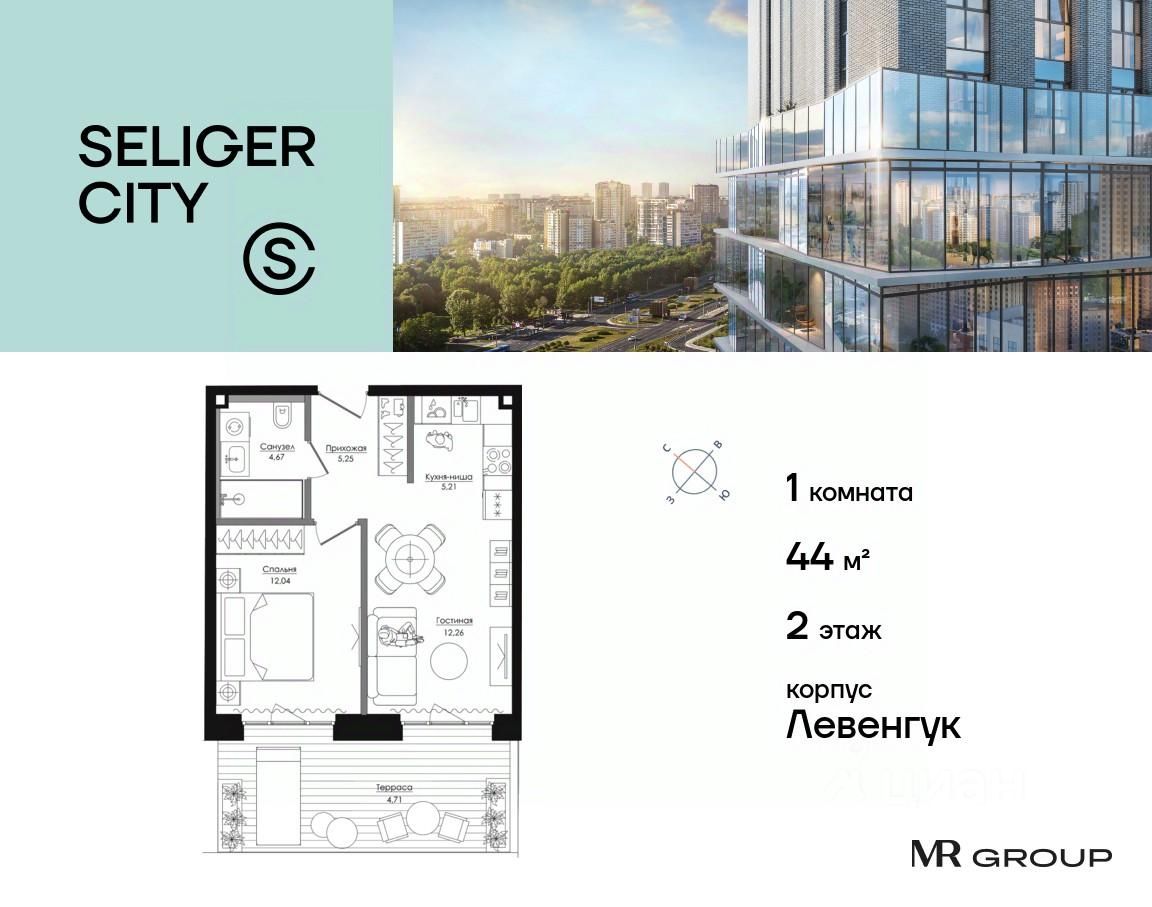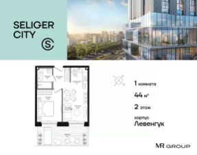 Продаётся 1-комнатная квартира общей площадью 44.04 м² без отделки в ЖК "Селигер Сити" на 2-м этаже 21 этажного дома.