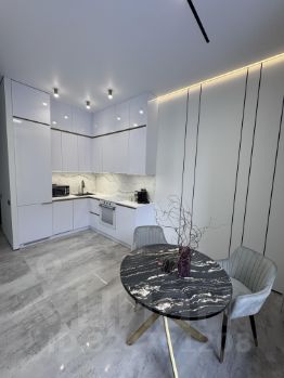 - полностью оборудованная кухня (посудомойка, индукционная варочная поверхность, фильтр для воды и т д) белая с бронзой (не золото, фото искажает немного)