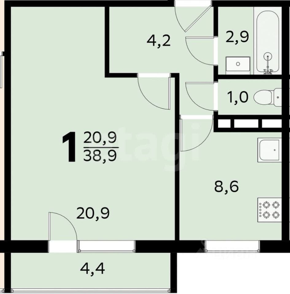 Планировка практична и функциональна: просторная кухня в 8 кв. м, отдельный санузел и утепленная лоджия, которую можно использовать как дополнительное пространство для отдыха или хранения.