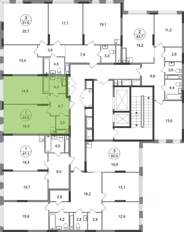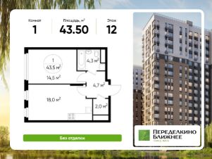 Общая площадь квартиры - 43,5 кв. м, этаж 12 из 17.