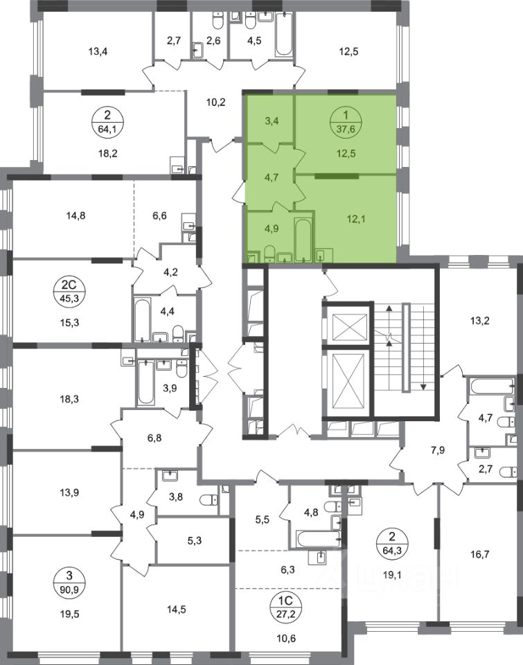 Общая площадь квартиры - 37,6 кв. м, этаж 2 из 17.
