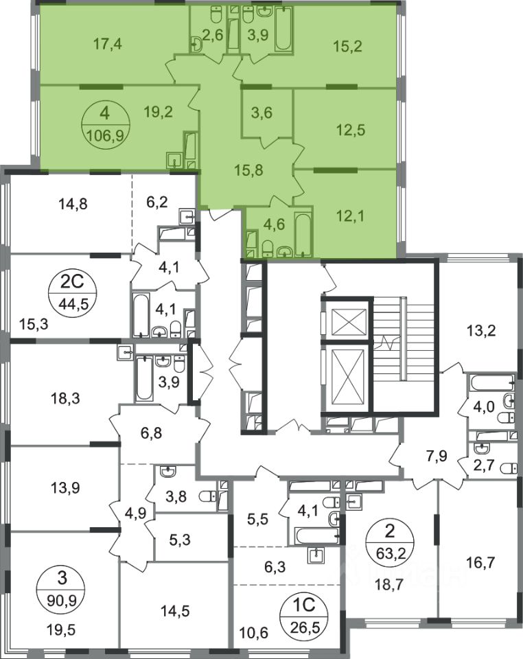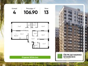 Общая площадь квартиры - 106,9 кв. м, этаж 13 из 17.