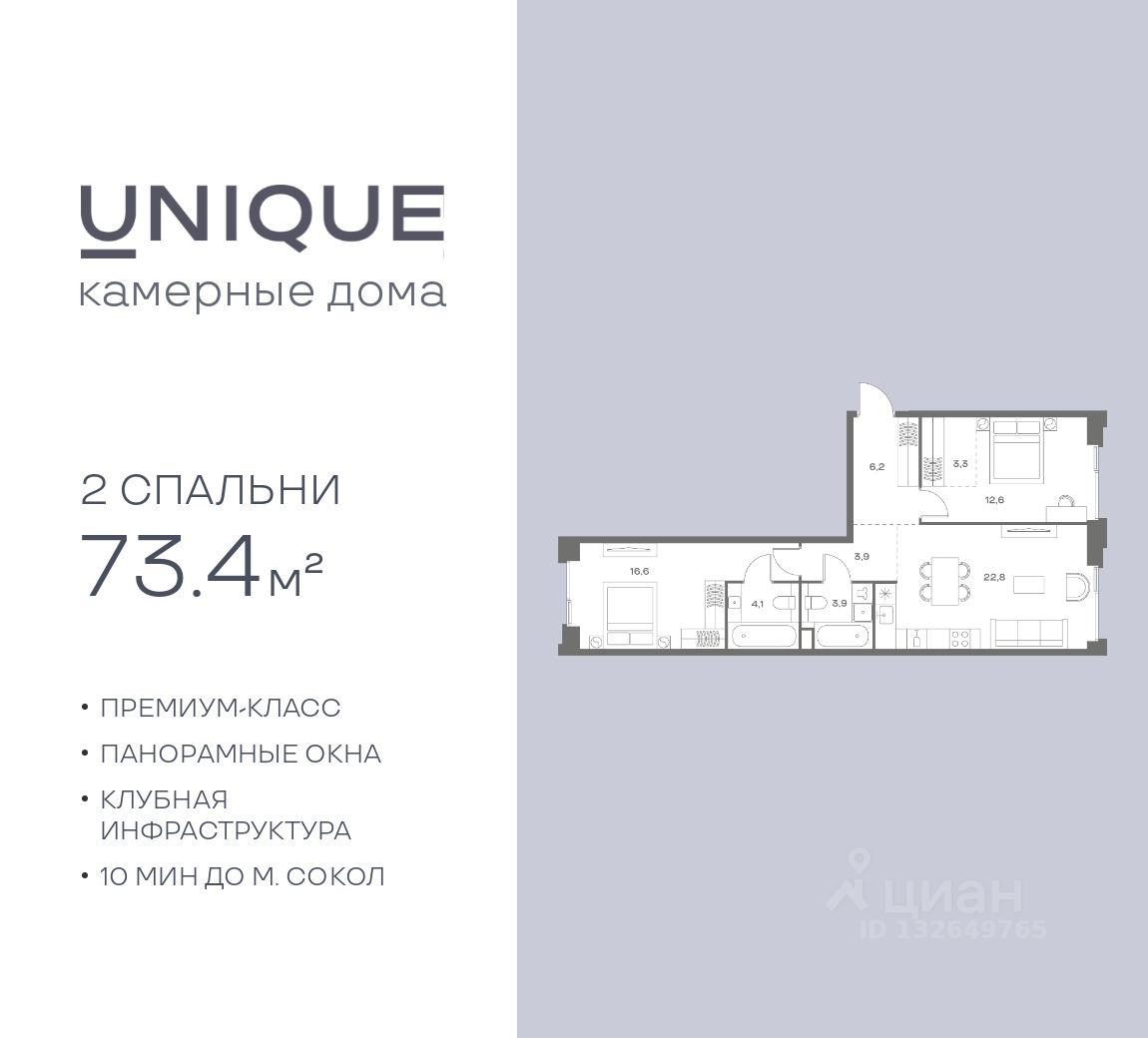 Продается 2-к. квартира номер 236 общей площадью 73.4 кв.м. на 6-м этаже 7 этажного дома, корпус UNIQUE (премиум-класс). Без отделки.