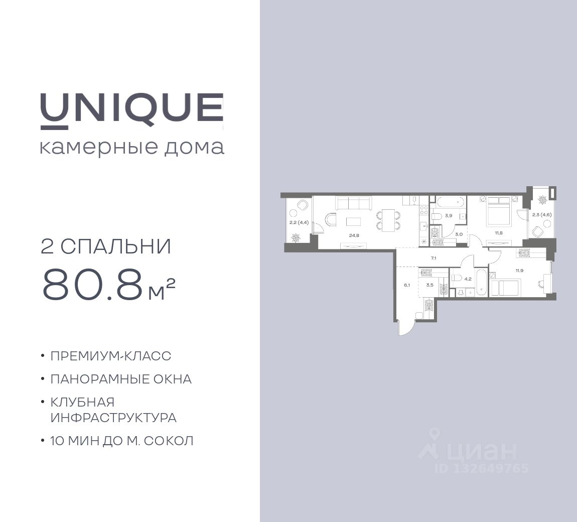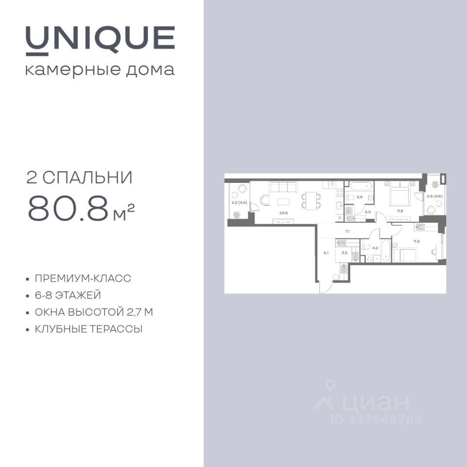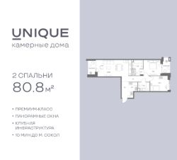 Продается 2-к. квартира номер 166 общей площадью 80.8 кв.м. на 6-м этаже 9 этажного дома, корпус UNIQUE (премиум-класс). Без отделки.