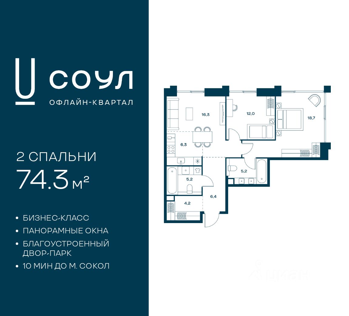 Квартиры с панорамными окнами, мастер-спальнями, гардеробными, классическими балконами и лоджиями, видовыми террасами. Высота потолков от 2,9 до 3,5 м.